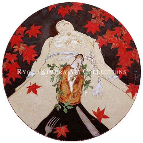 Aperitifs2, Cream spaghetti with a pie of a matsutake mushroom under the autumnal leaves Japanese pigments on paper / φ28.0 cm / 2005