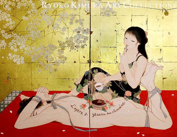 Dessert, A man's body dish for L'opera gateau au chocolat Japanese pigments, Gold leaves on paper / Standing screen : 97.0 ×120.0 cm / 2005