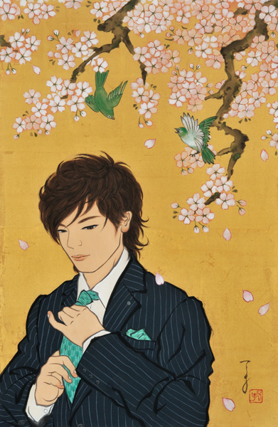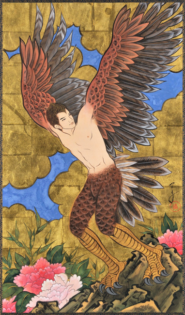 Dragon boy ascend to sky Japanese pigments, Gold leaves on Japanese paper 116.7×72.7 cm 2010 |