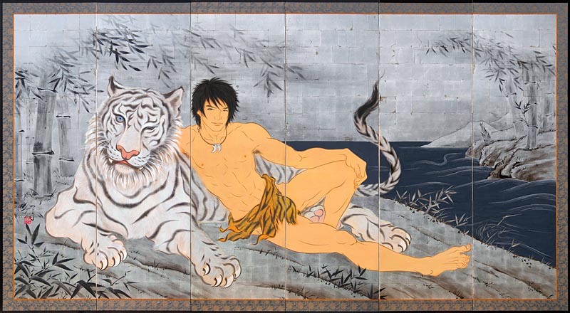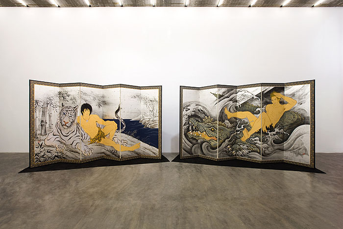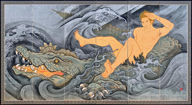 水辺でホワイトタイガーとくつろぐ静のターザン、ワニに乗ってダイナミックな波乗りに興じる動のターザン、左右の屏風の対比も、楽しんでいただければと思っています。